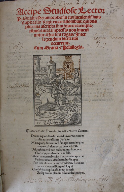 Metamorfosis, que ya se había utilizado en la edición veneciana de 1497. Como en la edición veneciana de 1497, el grabado que ilustra la disputa por las armas de Aquiles y el suicidio de Ayax en el libro 13, aparece repetido dos veces (números 48 y 50).