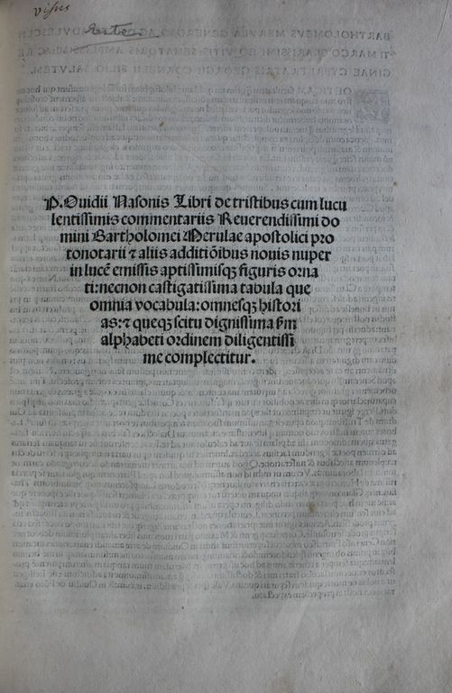 Conjunto de cinco xilografías, una al comienzo de cada libro, que ocupan más de un tercio de la caja de texto. Cada grabado presenta una sola escena relacionada con las circunstancias vitales de Ovidio en relación con el exilio y el contenido de las